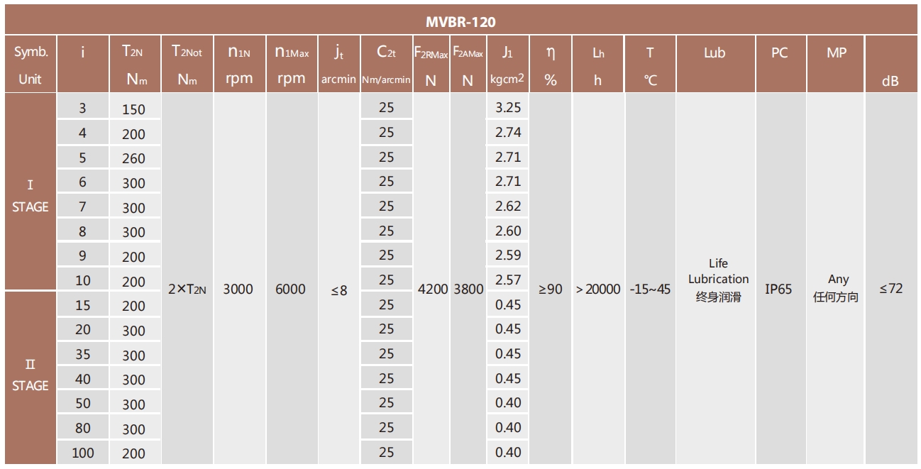 MVBR-120-L2系列超精密背隙行星減速機系列(P0): MVBR-120-L2系列精密背隙行星減速器系列(P1): MVBR-120-L2系列標準背隙行星減速機系列(P2):